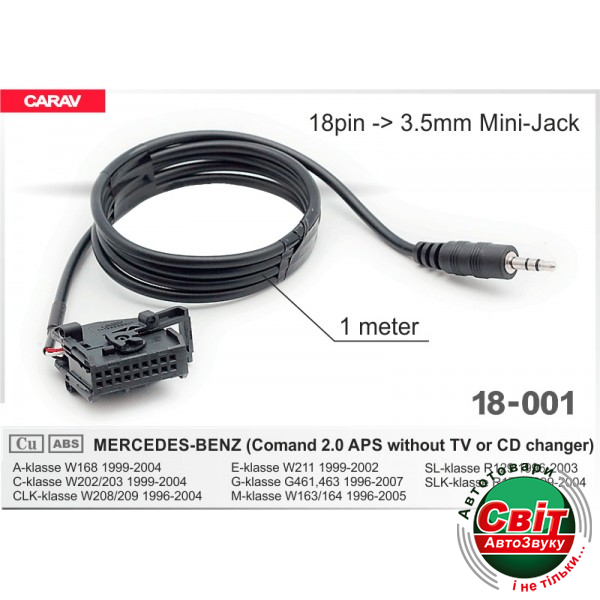 Кабель адаптер AUX Carav 18-001 MercedesКабель адаптер AUX Mercedes Carav 18-001 для подключения аудио плеера, навигатора, cd-чейнджера, DVD проигрывателя и любого другого аудио устройства к штатной магнитоле.