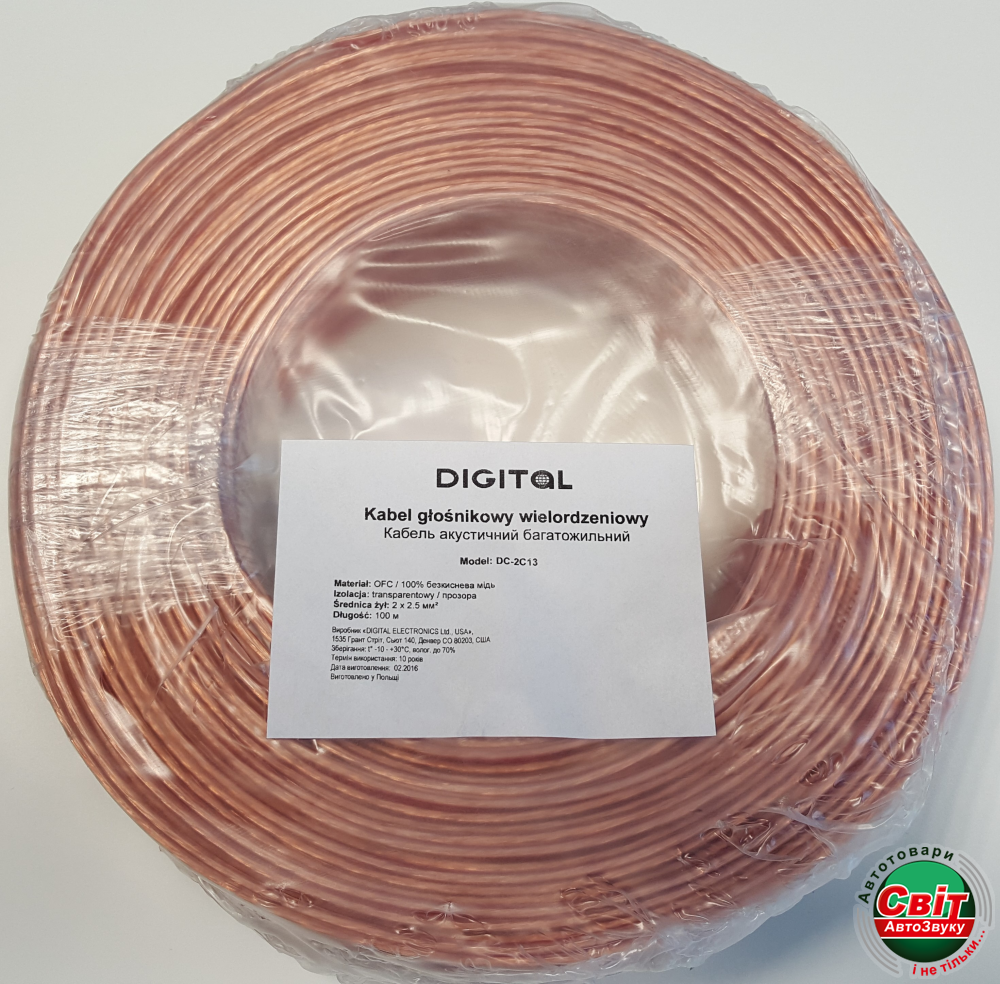акустический кабель Digital DC-2C13 сечением 2 х 2,5 мм2 в прозрачной оплетке. Бухта длиной 100 м для подключения акустической системы, сабвуфера, усилителя.