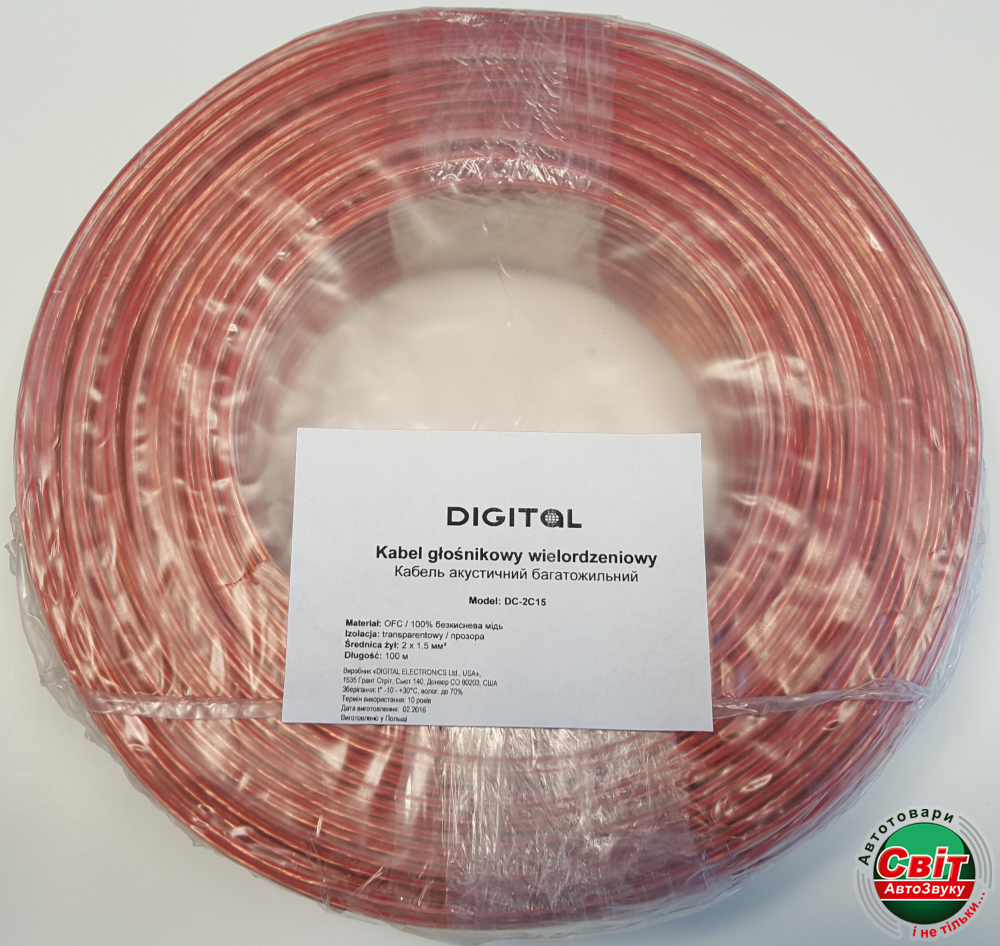 Кабель акустичний Digital DC-2C15 15AWG / 100m bulk (1m)акустический кабель Digital DC-2C15 сечением 2 х 1,5 мм2 (15 AWG) в прозрачной оплетке. Бухта длиной 100 м для подключения акустической системы, сабвуфера, усилителя.