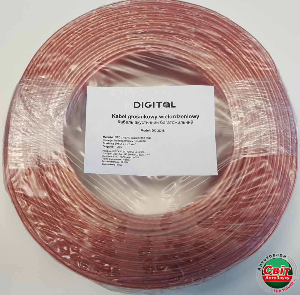 Кабель акустичний Digital DC-2C18 18AWG / 100m bulk (1m)акустический кабель Digital DC-2C18 сечением 2 х 0,75 мм2 в прозрачной оплетке. Бухта длиной 100 м для подключения акустической системы, сабвуфера, усилителя.