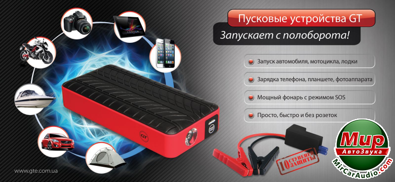 Портативний запускний пусковий пристрій від ТМ GT просто і без розеток вирішить проблему розрядженого акумулятора машини або гаджета. Цей імпульсний пусковий пристрій завжди виручить у непередбаченій ситуації – запустить різні типи двигунів з напругою 12В і 24В (тільки модель S23), а також легко зарядить будь-яку портативну електроніку через USB-інтерфейс або DC-роз'єм. Переваги пускових зарядних пристроїв GT - висока ємність вбудованої батареї до 23000 мАг (модель S23) і найширший асортимент обладнання, що підключається. Завдяки компактним габаритам корпусу пристрій зручно утримувати у багажнику автомобіля або брати із собою у похід.