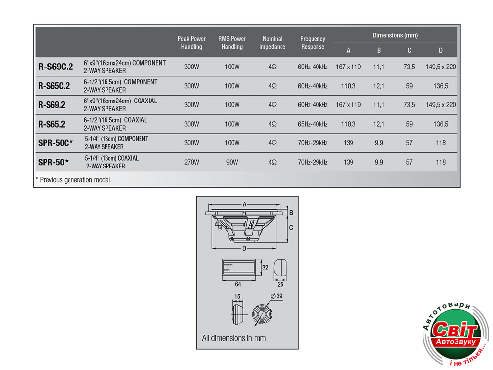 Автоакустика Alpine R-S69.2Це 2-смугова коаксіальна акустична система серії R-Series, вона розроблена для відтворення великої потужності, водночас з винятковою чистотою звуку. Також вирізняються високою ефективністю та простотою встановлення в різні автомобілі. Ця модель видає широкий частотний діапазон, від 60 Гц до 29 000 Гц, і напористий бас. Номінальна потужність RMS 100 Вт і максимальна потужність 300 Вт. Номінальний електричний опір звукової котушки 4 Ом, це необхідно враховувати під час узгодження підсилювача та навантаження динаміка. Чутливість 88 дБ/Вт.