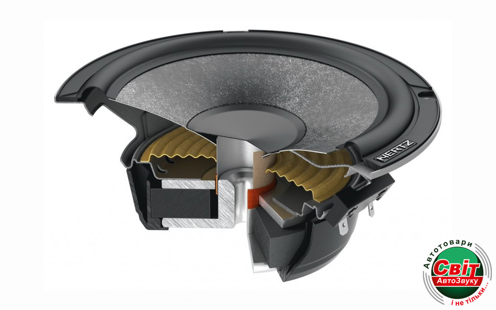 Автоакустика Hertz C 165Hertz C 165 мідбас із лінійки Hertz Cento. Багато часу було витрачено на дослідження ідеального матеріалу для мідбасів Hertz C 165: завдяки тривалому процесу настроювання матеріалів SPP-M був обраний (Semi Pressed Paper-Mica), який зберігає природний звук напівпресованого паперу та вдосконалює його за допомогою порошку слюди, що покращує жорсткість. Результат — чудовий баланс між легкістю й демпфуванням, який необхідний для потужного та керованого відтворення. Магнітний феритовий магніт забезпечує чудовий контроль навіть за великих відхилень.