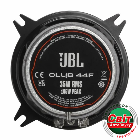 Автоакустика JBL Club 44FJBL Club 44F є частиною серії коаксіальних та компонентних гучномовців Club від JBL, які призначені для того, щоб принести професійний звук JBL у більше автомобілів. Їх компактний дизайн дозволяє їм вміститися у більшість автомобілів, і вони оснащені повністю керованим шовковим домовим твітером, який забезпечує ширший та гладший відгук на високих частотах без жорсткості, незалежно від рівня виводу, у порівнянні з більш поширеними w-domes.