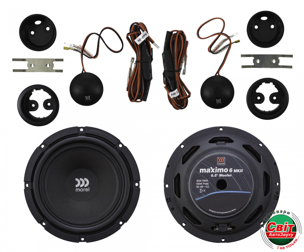 Автоакустика Morel Maximo 6 MKIIКомпонентна акустика Morel Maximo 6 MKII, що підходить як для апгрейду штатної акустики, так і для використання з підсилювачем. Дифузор мідбасового динаміка виконаний з паперового композиту, і змонтований з подвійним підвісом зі спіненого поліуретану. У звучанні 25 мм тканинного купольного твітера відсутня різкість, яка властива акустиці у цьому ціновому діапазоні. Така конструкція розширює частотні характеристики, а також дає високу детальність та точність звучання. Фільтри ВЧ невеликих розмірів, що суттєво полегшує їхню установку в автомобілі.
