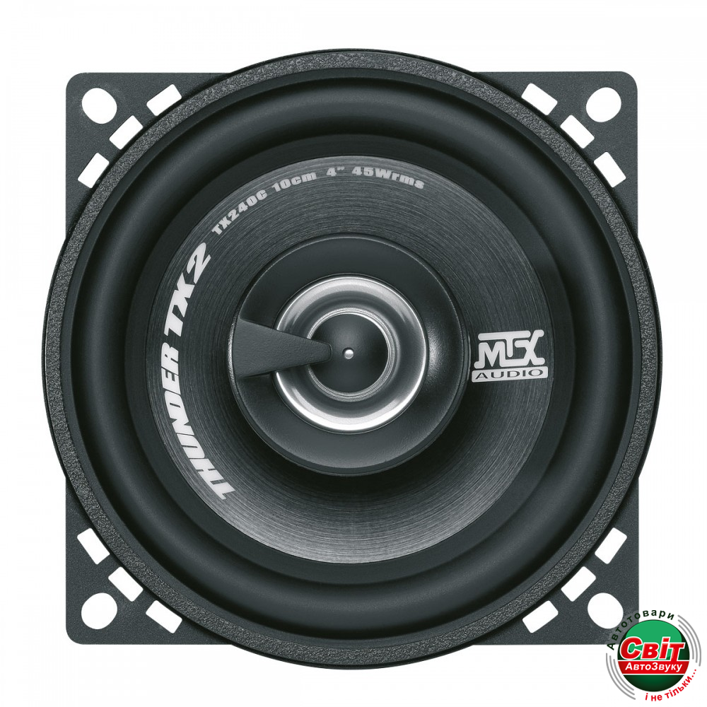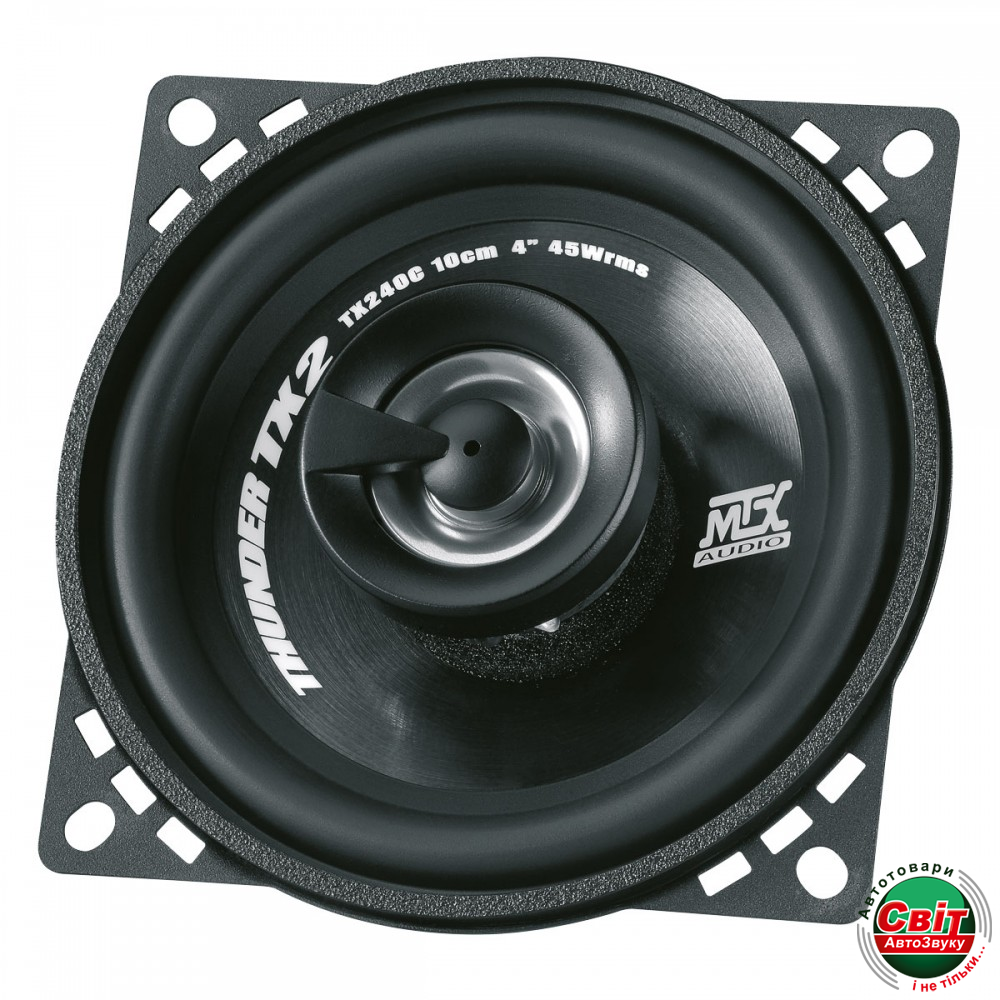 Автоакустика MTX TX240CКоаксіальна акустика MTX TX240C (4-дюймова 2-смугова коаксіальна, 45 Вт RMS, пікова потужність 310 Вт) відрізняються якістю звуку, дуже високою потужністю та винятковим оздобленням. Рекомендується використовувати TX240C з невеликим сабвуфером з підсилювачем, таким як MTX RTT8P, RTP8 або RTF10P для посилення низьких частот.