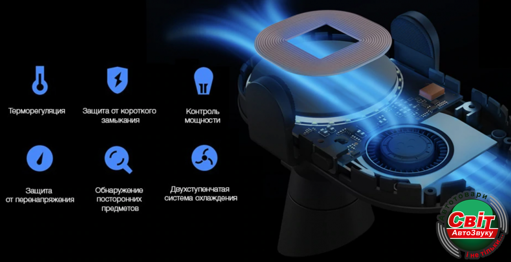 Зарядное устройство оснащено вентилятором, который самостоятельно регулирует мощность подачи воздуха в зависимости от температуры устройства. Встроенная металлическая опора быстро проводит тепло, повышая скорость охлаждения. Двухступенчатая система охлаждения не допускает чрезмерного нагревания смартфона во время зарядки на высокой мощности, так что смартфон не запускает систему защиты от перегрева, которая снижает скорость зарядки. Кроме того, устройство оснащено и другими видами защиты от сбоев в работе, включая короткое замыкание и перенапряжение.