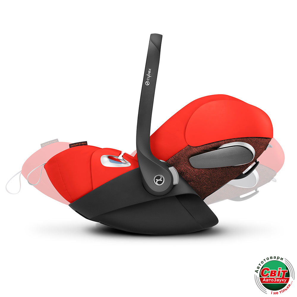Модель Cybex Cloud Z i-Size имеет удобную регулируемую по наклону ручку для переноски в руках и складывающийся козырек размера XXL, который оберегает малыша от солнца, ветра и осадков.