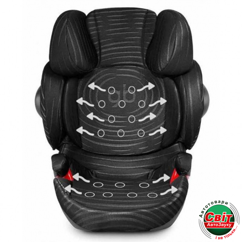 Сетчатые вентиляционные каналы проходят через спинку и сидение автокресла. Воздух проходит через отверстия над покрытием автокресла и обеспечивает комфортную температуру сиденья даже в самые жаркие дни.