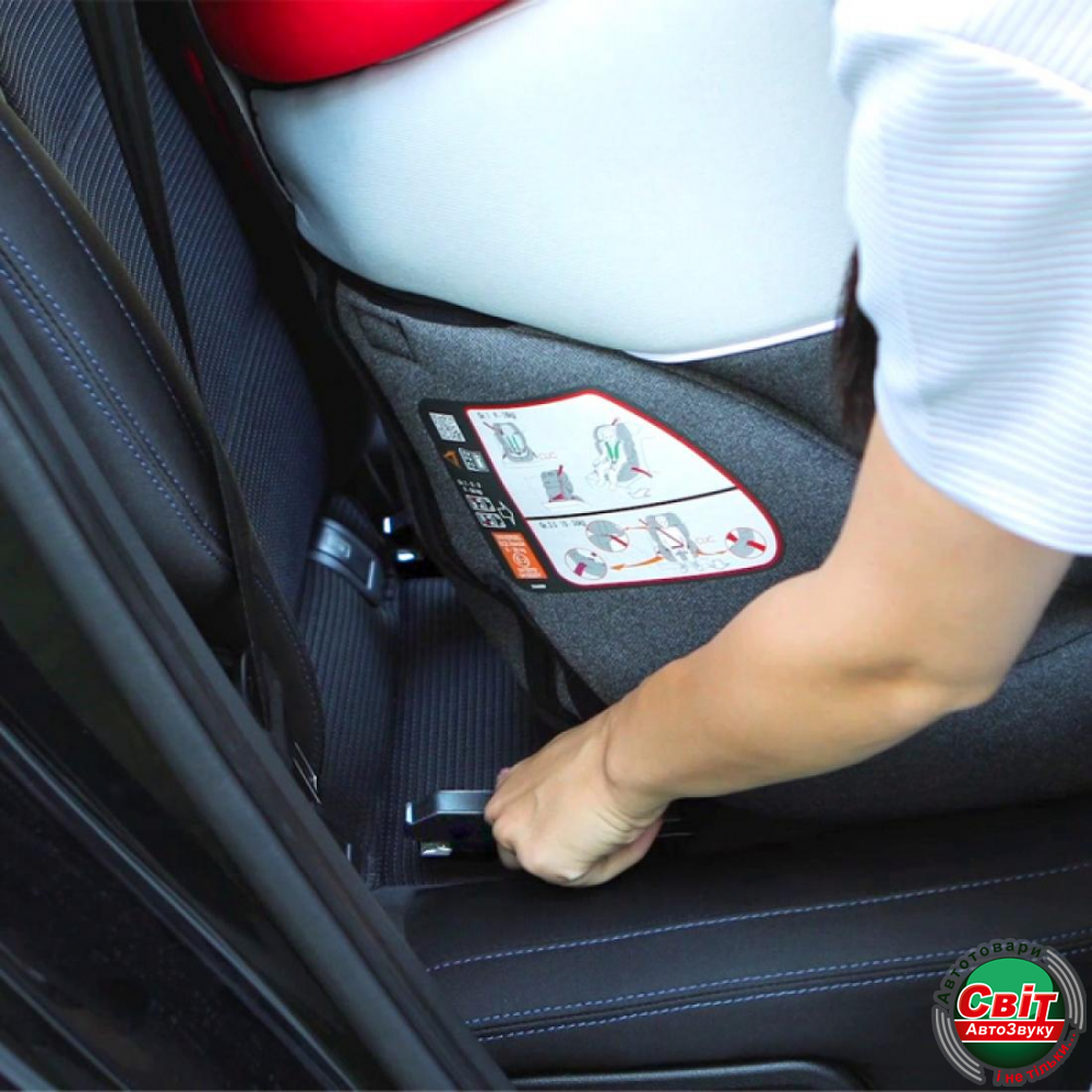 Крепится в автомобиле с помощью системы Isofix или штатными ремнями безопасности, устанавливается по ходу движения на заднем сиденье автомобиля, или на переднем при отключенной подушке безопасности.