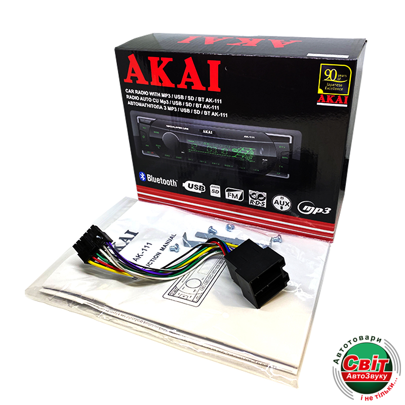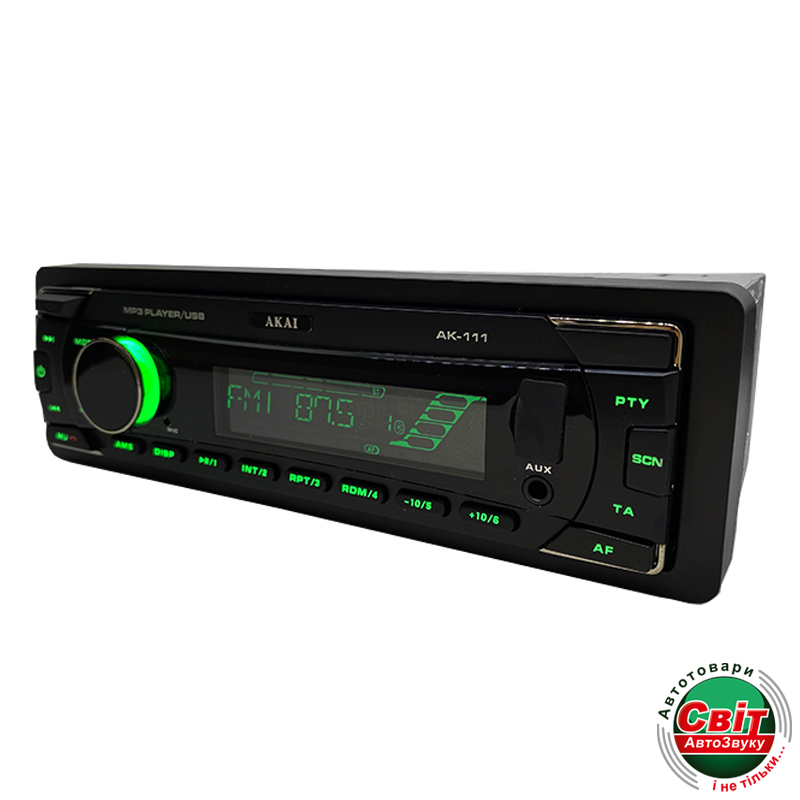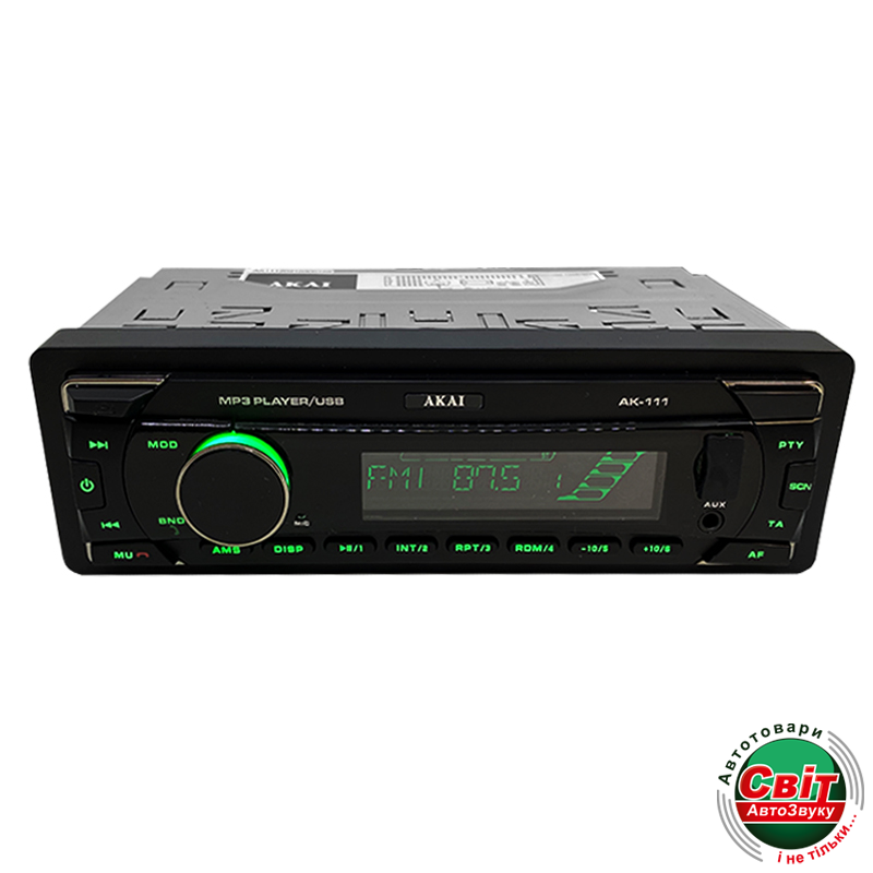 Автомагнітола Akai AK-111Автомобільна магнітола Akai AK-111 це простий, надійний і функціональний ресівер, з високою якістю звучання. Встановлення пристрою просте і не займе багато часу та зусиль. Універсальний розмір 1DIN, підходить для всіх автомобілів. З’ ємна передня панель, стильний дизайн і зелена підсвічування кнопок разом з усіма сучасними функціями Вихідна потужність 4 x 45 Вт.
