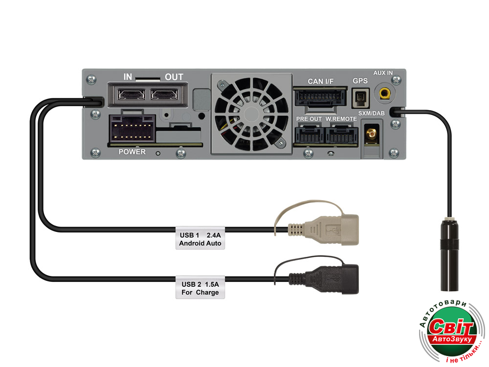 Apple CarPlay (бездротовий) і Android Auto (дротовий) на шасі 1-DIN, підтримка FLAC, MP3, WMA, AAC, WAV, APE, AVI, MP4, MOV, FLV, MKV, Bluetooth, FM-радіо, DAB+ цифрове радіо, 6 лінійних виходів 4 Вольт, 2USB (USB-порт 1 для даних / USB-порт 2 для заряджання), AV-aux, HDMI вхід/вихід, два входи для камер (Direct-роз'єми)
