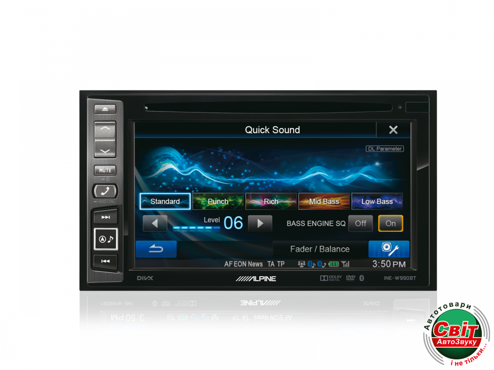 INE-W990BT это ваш лучший выбор для превосходного качества звука и настройки с системой BASS ENGINE SQ. Вы можете точно настроить звук с помощью дополнительных функций, таких как цифровая временная коррекция, 9-полосный параметрический эквалайзер. Лучший способ из всех возможных вариантов настройки вашей системы это настройка при помощи приложения TuneIt и 24-битного ЦАП и 4-вольтовых выходов предусилителя!