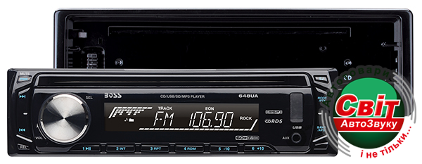 Автомагнітола Boss Audio 648UAМонтажний розмір: 1DIN Тип дисплея: активноматричный PLL синтезатор AM/FM-тюнер AM станцій: 12 FM станцій: 18 Пам'ять на 30 радіостанцій Перемикання регіонів радіо: США, Європа Функція RDS (Radio Data System) Підтримка ID3-тегів Вбудований CD-привід підтримує наступні формати: MP3, CD, CDR, RW, WMA USB вхід: повнорозмірний на передній панелі Картрідер SD/MMC: на задній панелі Вхід AUX: на передній панелі Характеристики Бренд:Boss AudioМодель:648UAТипорозмір:1 DINЗнімна передня панель:+CD привід:єUSB:+SD/MMC:+Потужність підсилювача:4x60 ВтАудіовхід / Аудіовихід:+ / +Пульт ДУ:+Основна підсвітка:синяКолір:чорнийГарантія:12 місяцяХарактеристики