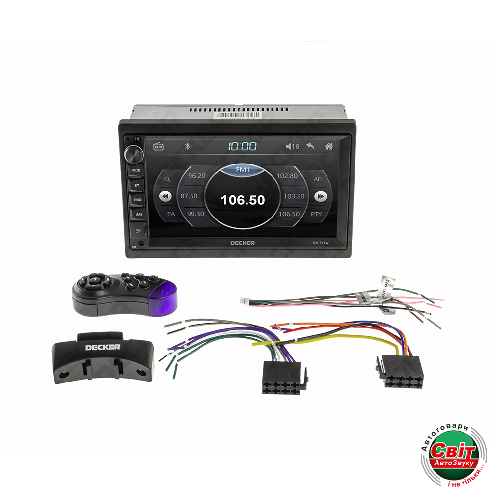 Автомагнітола Decker DV-711WУніверсальна 2DIN мультимедійна станція Decker DV-711W на операційної системи Wince 6.0, Укорочений корпус (глибина 60мм), Багатомовне меню, Контрастний ємнісний 7" TFT дисплей, Висока вихідна потужність (4 х 45 Вт), Модуль Вluetooth з підтримкою відтворення музики, Вбудований мікрофон, Змінювана підсвітка кнопок (6 кольорів), Відтворення аудіо, відео, фото з USB і microSD. Відеовхід для камери заднього огляду, Відеовхід для камери переднього виду. Можливість затемнення/вимкнення підсвічування дисплея (нічний режим)