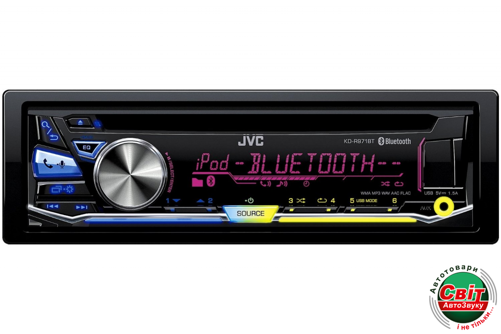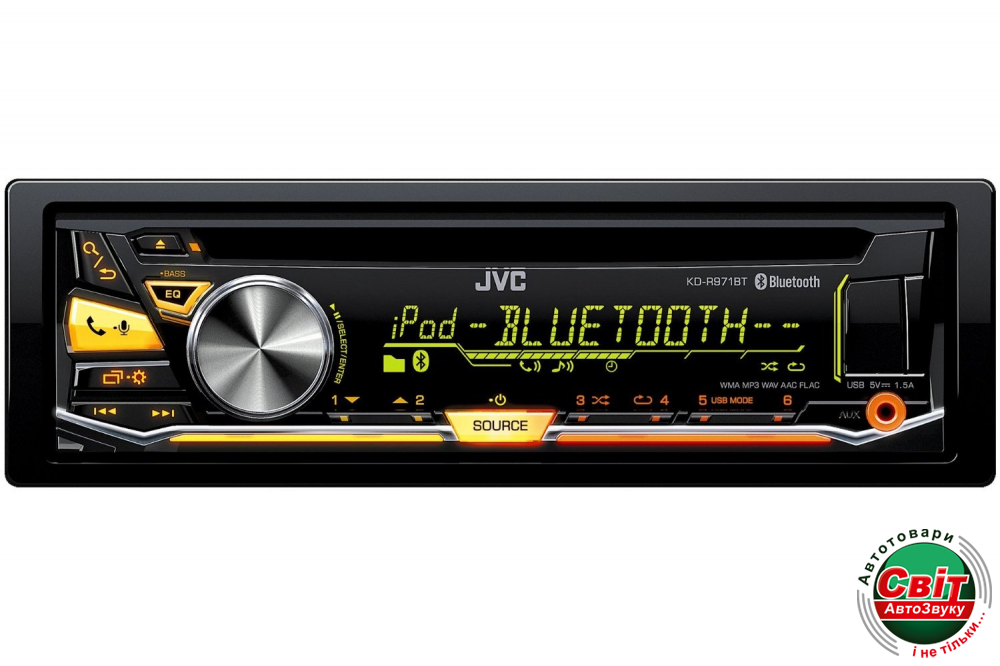 Автомагнітола JVC KD-R971BTEYCD-ресивер с беспроводной технологией Bluetooth® и входами USB и AUX на передней панели, MOS-FET 50 Вт x 4, Прямое подключение сабвуфера (монофоническое, через левый канал), Съемная лицевая панель