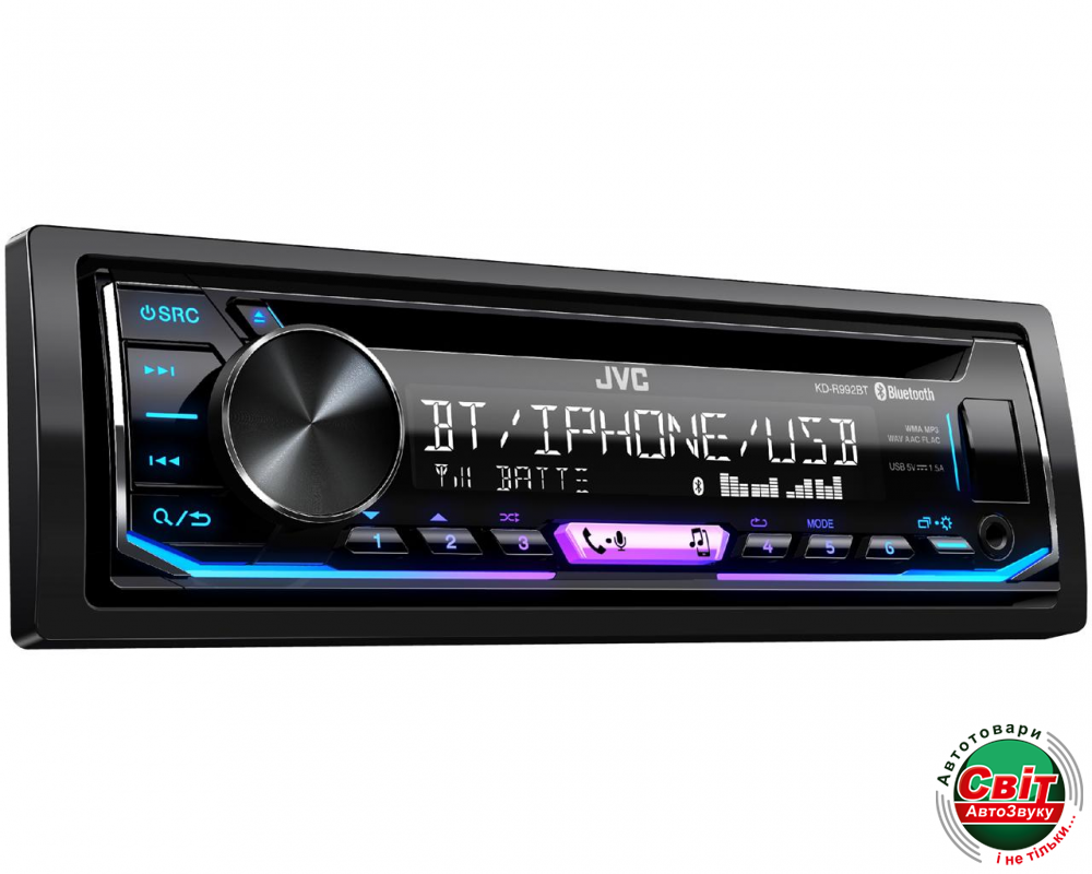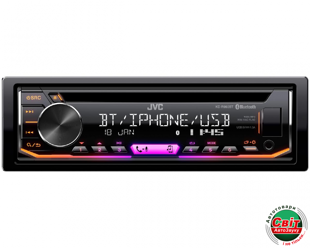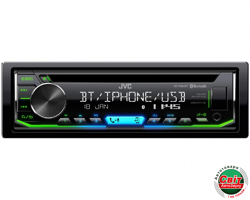 Автомагнітола JVC KD-R992BTCD-приемник JVC KD-R992BT с технологией Bluetooth для громкой связи и беспроводной потоковой передачи музыки, добавленный в дополнение к проводному способу воспроизведения музыки через USB от смартфонов Apple и Android. В любом режиме на большом прозрачном ЖК-дисплее будут отображаться дорожки, исполнители, данные альбома с вашего смартфона Apple или Android. Пользователи приложения Spotify будут рады узнать, что эти приемники полностью совместимы для воспроизведения и поиска музыки. Система Bluetooth позволяет одновременно подключать 2 телефона с громкой связью и до 5 музыкальных устройств Bluetooth, которые будут индивидуально выбраны в любое время. Переменная подсветка цветной клавиши позволит идеально подогнать вашу приборную панель.