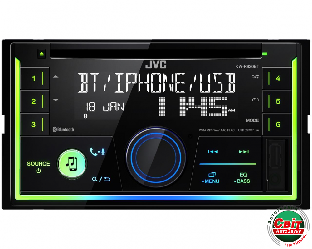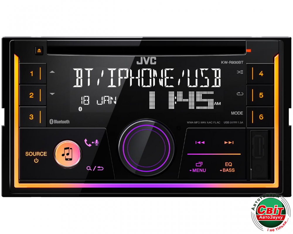 Автомагнітола JVC KW-R930BTИзмените приборную панель вашего автомобиля с помощью компактного цифрового медиаприемника CD-RW JVC KV-R930BT 2DIN. Предназначен для тех, кто хранит свою музыку на своих смартфонах Apple iPhone или Android и хочет слушать на ходу. Воспроизведение музыки может осуществляться через беспроводную передачу данных Bluetooth или напрямую подключаться к входу USB. Метод USB также поддерживает зарядку вашего смартфона. В дополнение к воспроизведению музыки 2 смартфона могут быть сопряжены для одновременного использования в режиме громкой связи. Пользователи приложений Spotify будут любить возможность поиска любимых треков и альбомов через Bluetooth или USB-соединение. Включен радиоприемник FM / AM.