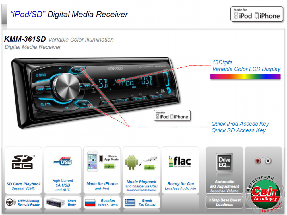 Автомагнітола Kenwood KMM-361SDЦифровой медиа-ресивер, SD, изменяемая подсветка, 2 пары линейных выходов