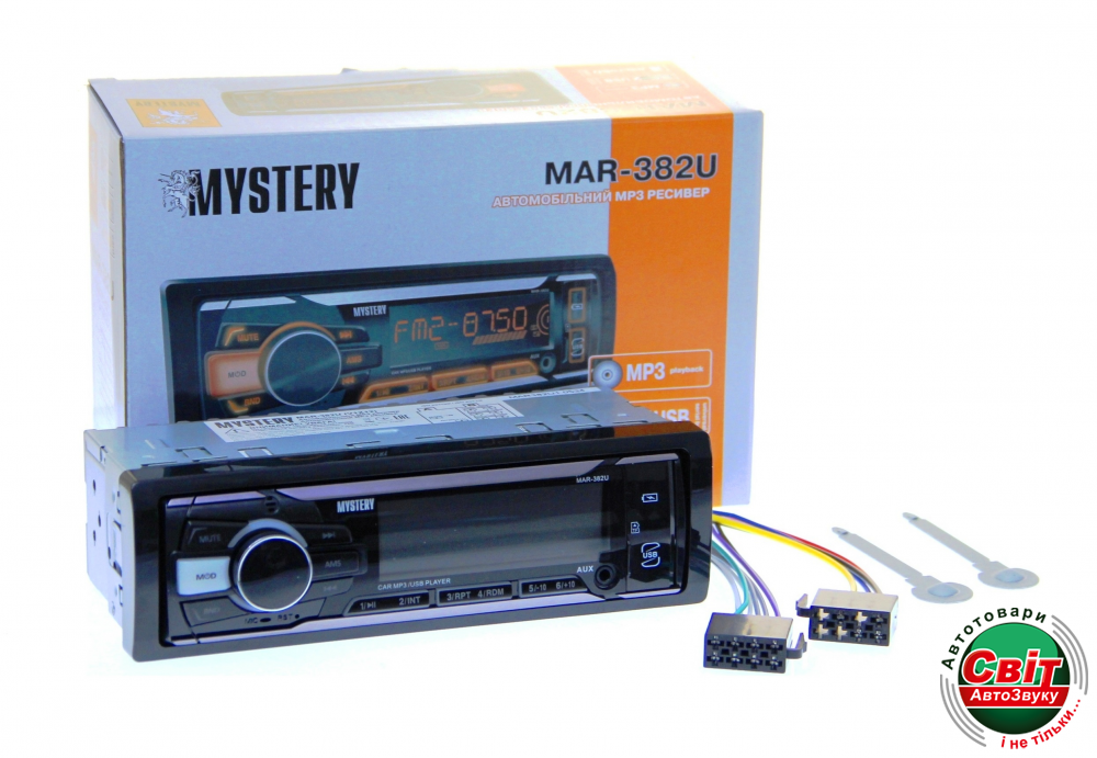 Автомагнітола Mystery MAR-382UАвтомобільний ресивер з підтримкою FM-радіо, MicroSD-карт та формату MP3. Для підключення є чотирьохканальний лінійний вихід RCA та роз’єм стандарту ISO. На передній панелі передбачено два USB-порта та аудіовхід на 3.5 мм. Також передбачено еквалайзер, функція тонкомпенсації та цифровий енкодер для регулювання гучності.