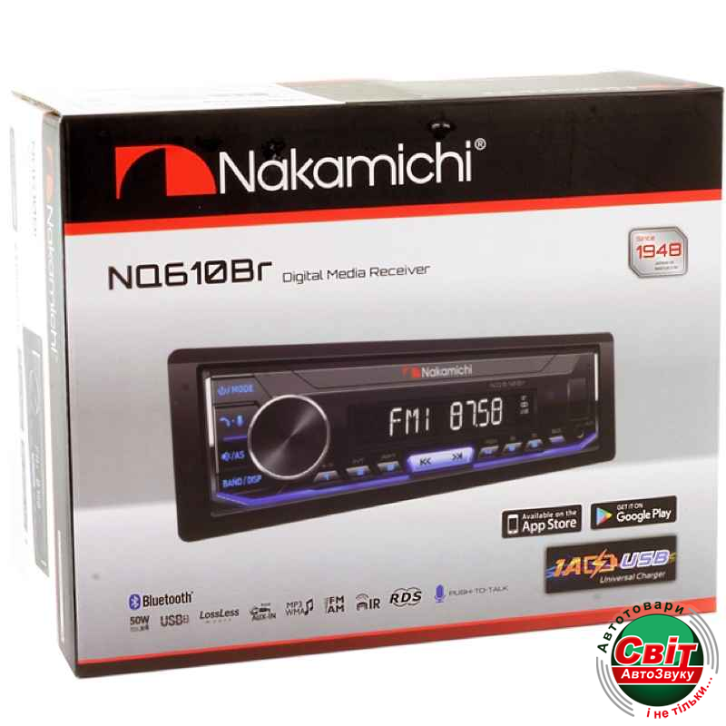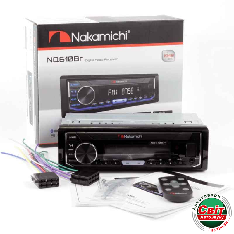 Автомагнітола Nakamichi NQ610BRМагнитола Nakamichi NQ610BR - медиаресивер с функцией AM / FM-радио, Bluetooth и Aux-In. Создайте свою медиатеку на флэшке USB и вставьте её в слот на лицевой панели, возьмите любимые треки с собой в дорогу. В качестве альтернативы вы можете просто подключить свой телефон к ресиверу через AUX-вход или используя потоковые аудио через встроенную функцию Bluetooth. Bluetooth также позволяет вам совершать и принимать звонки через CD-ресивер, не переключая внимания на телефон.