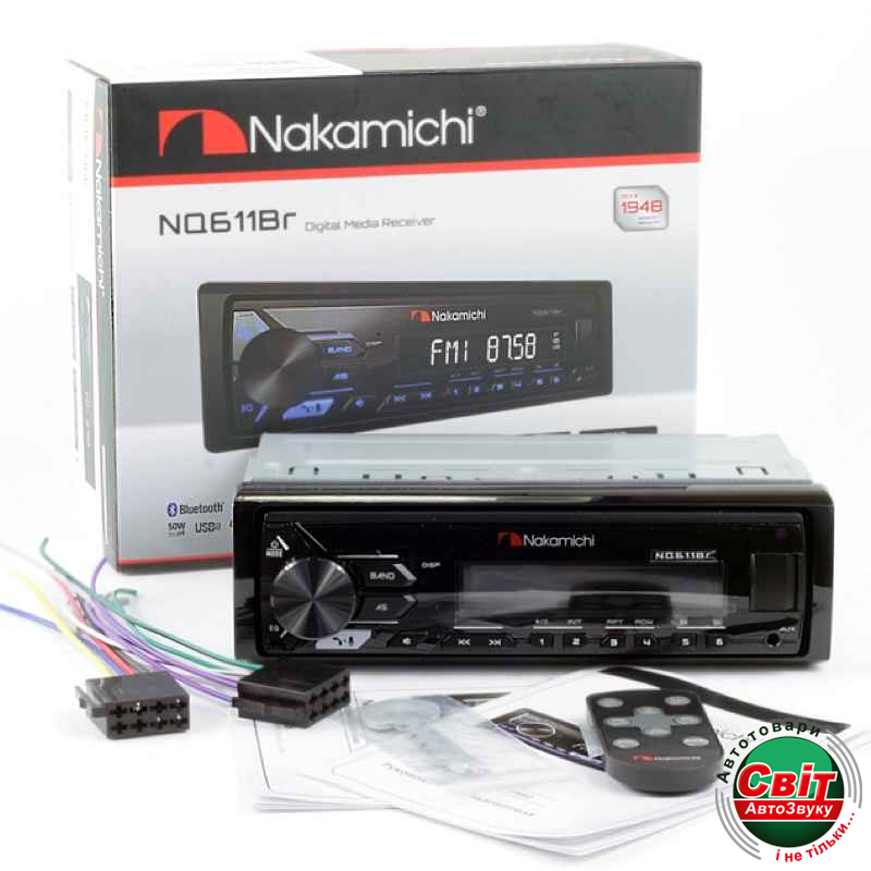 Автомагнітола Nakamichi NQ611BRМагнитола Nakamichi NQ611BR - медиаресивер с функцией AM / FM-радио, Bluetooth и Aux-In. Создайте свою медиатеку на флэшке USB и вставьте её в слот на лицевой панели, возьмите любимые треки с собой в дорогу. В качестве альтернативы вы можете просто подключить свой телефон к ресиверу через AUX-вход или используя потоковые аудио через встроенную функцию Bluetooth. Bluetooth также позволяет вам совершать и принимать звонки через CD-ресивер, не переключая внимания на телефон.