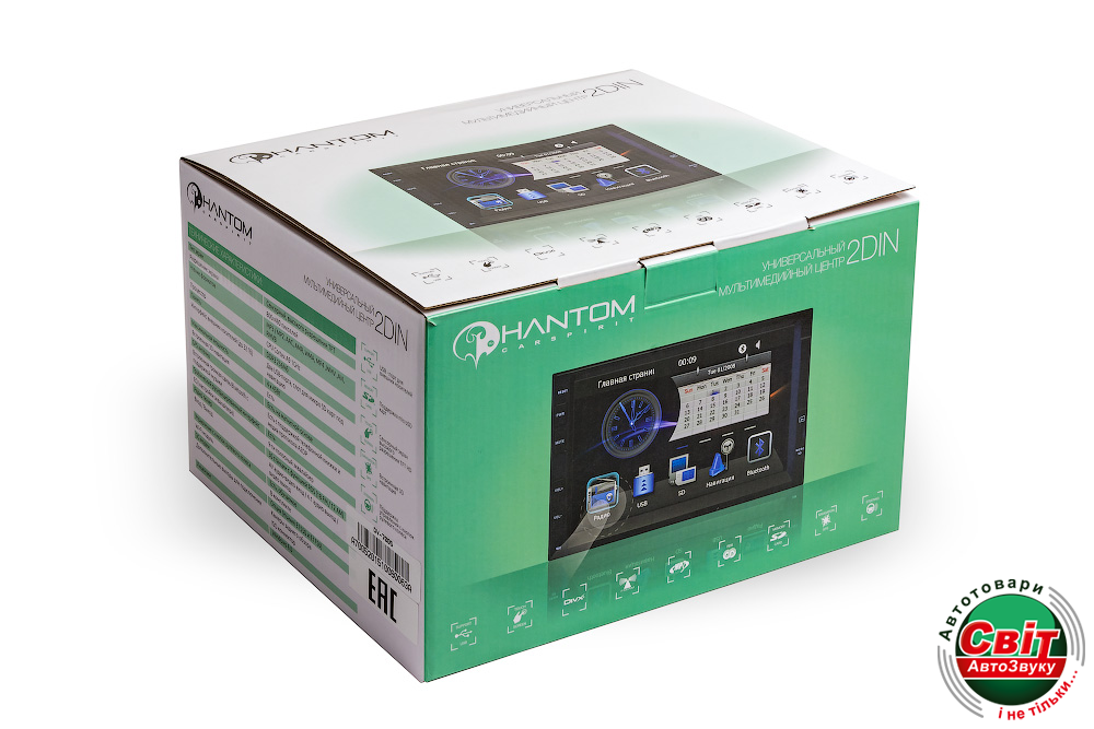 Автомагнітола Phantom DV-7005Универсальный мультимедийный центр 2 DIN WinCE 6.0 PHANTOM DV-7005— это 2DIN мультимедийный центр с навигацией, предназначенный для установки в автомобили, оснащенные 2DIN шахтой для головного устройства. Мультимедийный центр для авто PHANTOM DV-7005 позволяет его владельцу оснастить свой автомобиль современным устройством, повышающим комфорт и безопасность вождения. Головное устройство PHANTOM DV-7005 совместимо со штатным оборудованием автомобиля — поддерживаются кнопки на руле (резистивные, есть режим обучения), меню мультимедийного устройства — русифицированное. Мягкая подсветка клавиш PHANTOM DV-7005 белого цвета включается при включении габаритных фонарей, при этом яркость экрана автоматически снижается. Также возможна плавная регулировка яркости экрана. Благодаря установке 2DIN магнитолы с навигацией PHANTOM DV-7005 пользователь получает современные, необходимые в дороге функции: AM/FM радиоприемник с памятью на 18 FM станций, 3D GPS навигацию (поддерживаются карты «Навител», «Mireo Don’t Panic» и другие), возможность слушать в дороге любимую музыку с различных носителей (USB, iPod), просматривать видео файлы и фотографии с USB флэшкарты. В комплект 2DIN автомагнитолы PHANTOM DV-7005 входит Wi-Fi адаптер, который позволяет подключаться к сети Интернет (также возможно использование 3G USB модема), для получения актуальных новостей и дорожной информации. Благодаря встроенному модулю Bluetooth (с отображением русскоязычной телефонной книги), при движении удобно и безопасно возможно пользоваться мобильной связью, а камера заднего вида, которую при желании легко можно подключить к мультимедийному центру для авто PHANTOM DV-7005, облегчает парковку и движение задним ходом в условиях ограниченной обзорности (также возможно подключение видео парковочного радара). Отдельный AV-вход, которым оснащен 2DIN мультимедийный центр PHANTOM DV-7005, позволяет подключить к нему камеру переднего обзора, или внешний цифровой ТВ-тюнер. Установка PHANTOM DV-7005 в различные модели автомобилей облегчается благодаря кабелю с разъемом ISO и монтажным креплениям, входящим в комплект поставки. Возможна установка логотипа автомобиля на заставку (предустановлено более 90 логотипов).