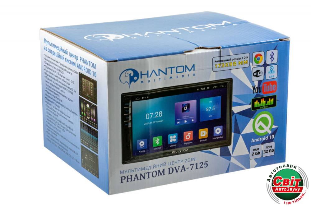 PHANTOM DVA-7125 це універсальний 7 дюймовий мультимедійний центр 2 DIN під управлінням сучасної операційної системи Android 10 з 4-ядерним процесором ARM AC8227L 1,3 Ггц, 2 Гб оперативної памяті та 32 Гб вбудованої памяті.Завдяки такому поєднанню, користувач отримує мультимедійний центр, який має набагато більший функціонал і продуктивність, ніж пристрої, що працюють під управлінням інших операційних систем.