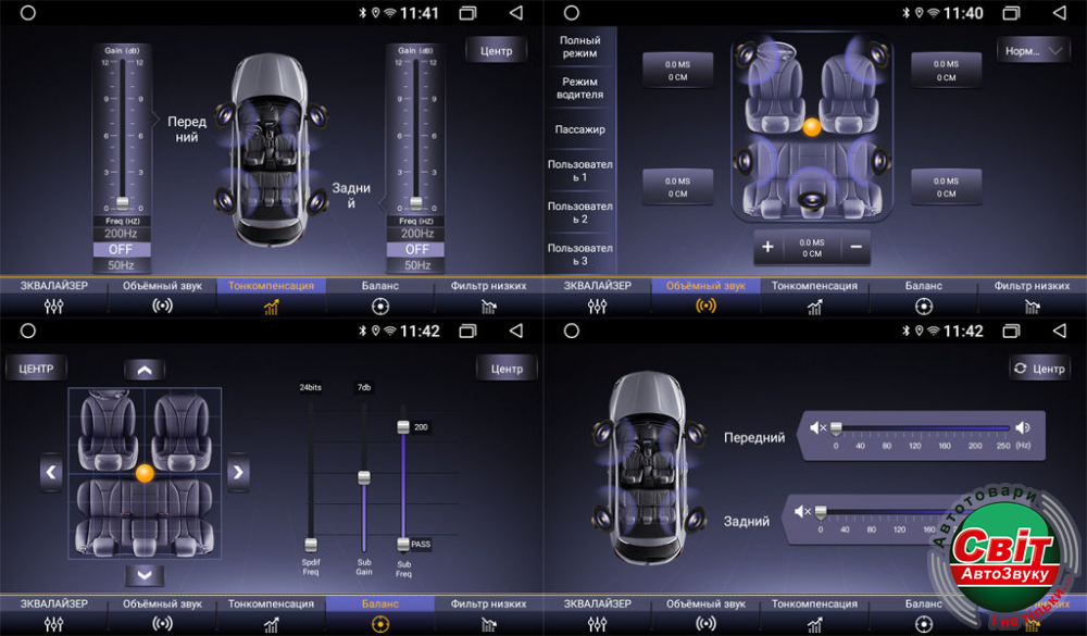 Баланс: Настройка звукового поля між пасажирами автомобіля та можливість регулювання параметрів сабвуфера Рівень і Смуга частот (Плавна настройка діапазону відтворюваних частот для сабвуфера від 0 до 250 Гц). Наприклад, можна вибрати смугу частот для сабвуфера і рівень посилення до 14 дБ.