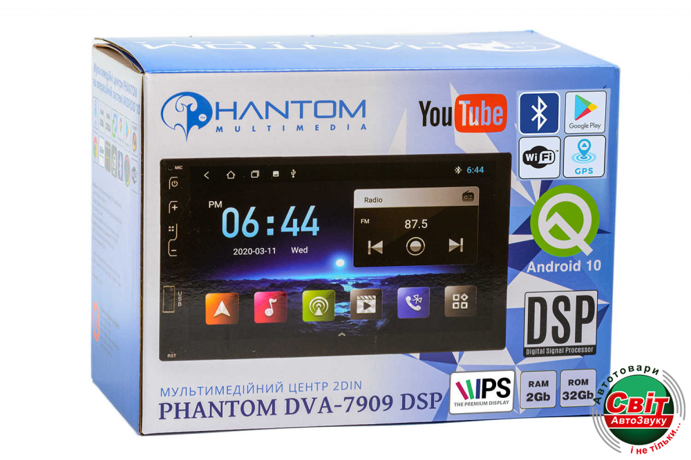Автомагнітола Phantom DVA-7909 DSPМультимедійний центр PHANTOM DVA-7909 DSP це універсальний 7-дюймовий мультимедійний центр 2 DIN під управлінням сучасної операційної системи Android 10 з 4-ядерним процесором ARM Cortex A53 4x1,5 ГГц, 2 Гб оперативної пам'яті і 32 Гб вбудованої пам'яті.