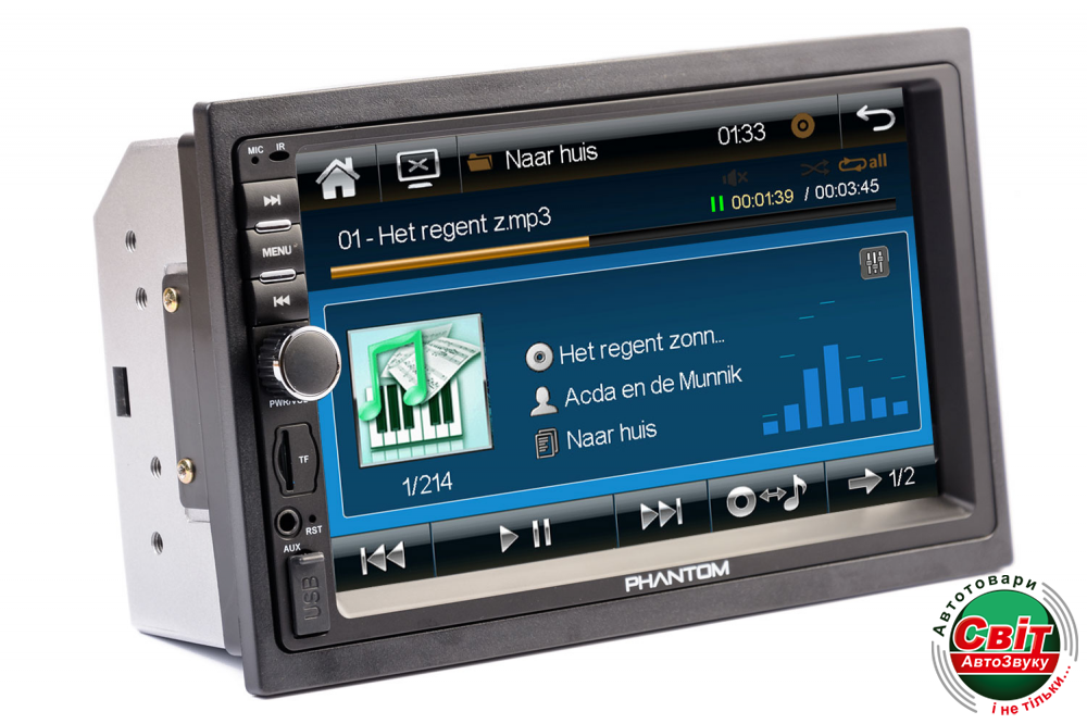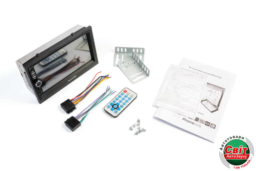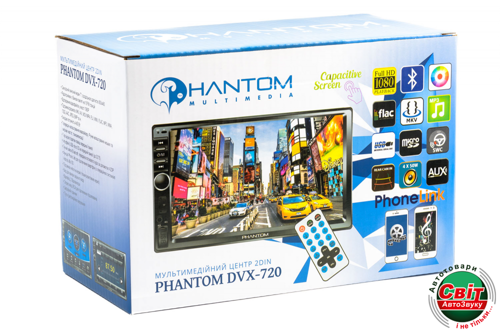 Автомагнітола Phantom DVX-720PHANTOM DVX-720 — это 2DIN мультимедийный центр, предназначенный для установки в автомобили. Мультимедийный центр для авто PHANTOM DVX-720 позволяет его владельцу оснастить свой автомобиль современным устройством, повышающим комфорт и безопасность вождения. Головное устройство PHANTOM DVX-720 совместимо со штатным оборудованием автомобиля — поддерживаются кнопки на руле (резистивные, есть режим обучения). Меню мультимедийного устройства русифицированное. Многоцветная подсветка клавиш PHANTOM DVX-720 включается при запуске автомагнитолы. Также возможна плавная регулировка яркости, контрастности и насыщенности экрана. Благодаря установке 2DIN магнитолы PHANTOM DVX-720 пользователь получает современные, необходимые в дороге функции: FM радиоприемник с памятью на 18 FM станций: возможность слушать в дороге любимую музыку; просматривать видеофайлы и фотографии с различных носителей (USB – флешкарты, микро – SD карты). Благодаря встроенному модулю громкой связи Bluetooth (с отображением русскоязычной телефонной книги) в процессе езды на автомобиле удобно и безопасно пользоваться мобильной связью.Также можно подключить камеру заднего вида, что существенно облегчит парковку и движение задним ходом в условиях ограниченной обзорности. Есть возможность подключения видеопарктроника Fighter FPS-01V. Отдельный AV-вход, которым оснащен 2DIN мультимедийный центр PHANTOM DVX-720, позволяет подключить камеру фронтального обзора или внешний цифровой ТВ-тюнер DVB-T2. Установка PHANTOM DVX-720 в различные модели автомобилей облегчается благодаря наличию кабеля с разъемом ISO и монтажным креплениям. Возможен выбор логотипа автомобиля на заставку (предустановлено 47 логотипов). Посредством функции PhoneLink к мультимедийному центру PHANTOM DVX-720 можно подключить смартфон на ОС Android и iOS.