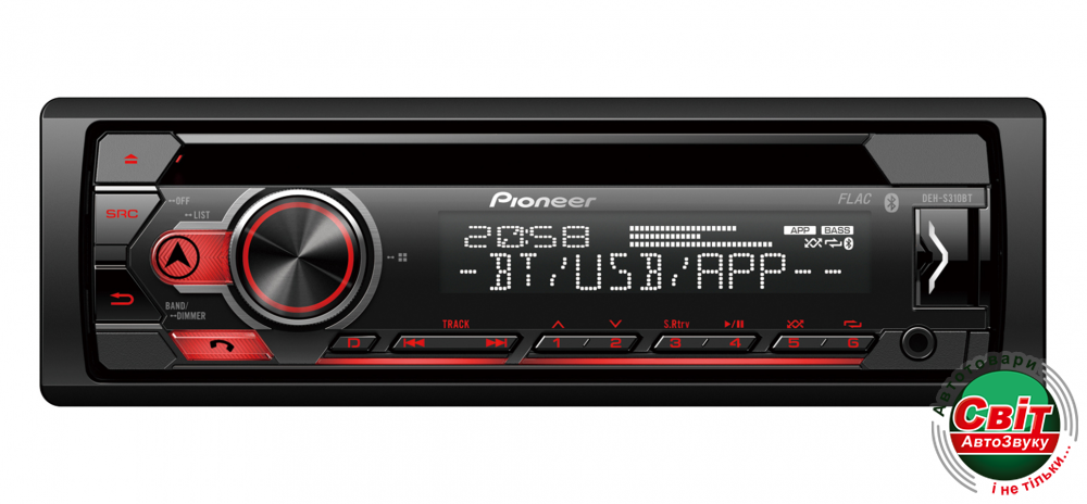 Автомагнітола Pioneer DEH-S310BTПривлекательный дизайн 1-DIN системы DEH-S310BT предоставляет достаточно места для вывода полезной информации. Чтобы максимально эффективно и безопасно использовать приложение Spotify или Pioneer Smart Sync, просто подключите смартфон Android.