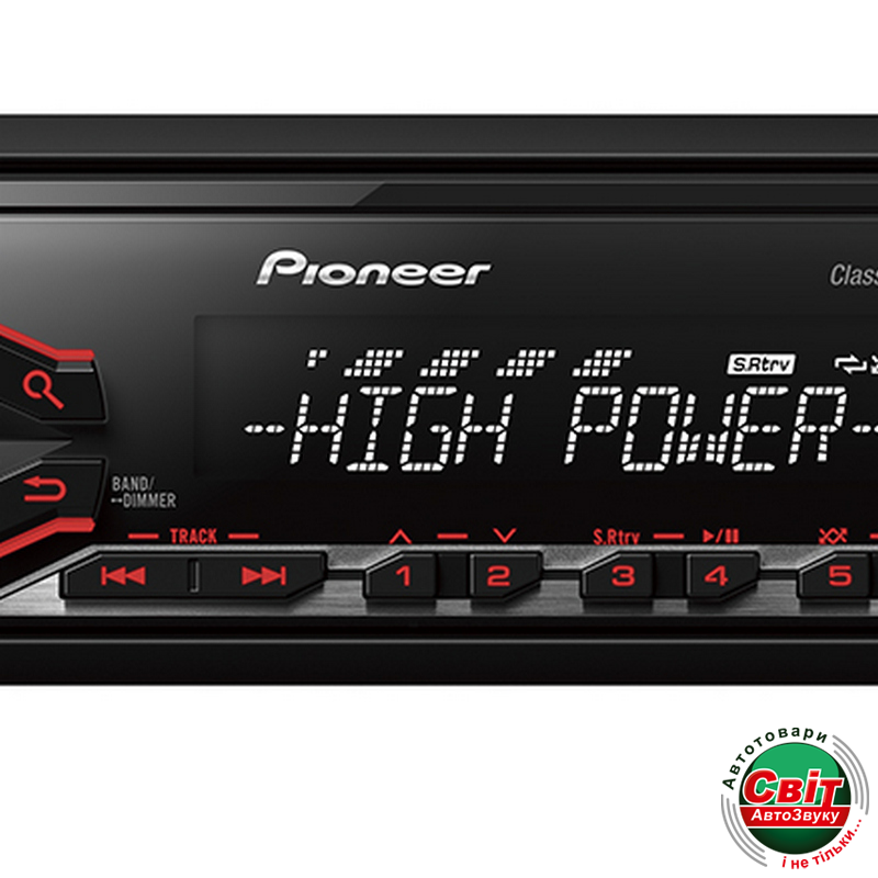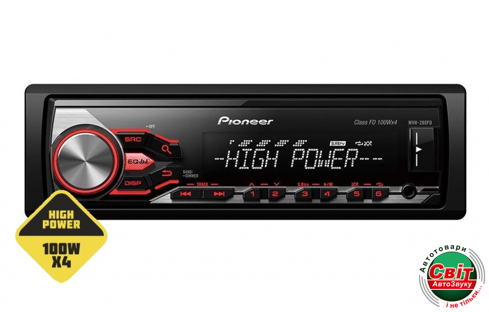 Автомагнітола Pioneer MVH-280FDВідрізняється оригінальним вбудованим підсилювачем класу FD (з подвоєною вихідною потужністю 4х100 Вт), який розроблений спеціально для отримання високої вихідної потужності при мінімально можливому енергоспоживанні. Інноваційна схемотехніка дозволила отримати високий ККД і радикально знизити теплові втрати. Головні пристрої здатні працювати стабільно тривалий час на граничних потужностях, при цьому практично не нагріваючись.