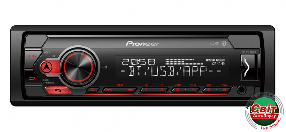 Автомагнітола Pioneer MVH-S310BTПривлекательный дизайн 1-DIN системы MVH-S310BT предоставляет достаточно места для вывода полезной информации. Чтобы максимально эффективно и безопасно использовать приложение Spotify или Pioneer Smart Sync, просто подключите смартфон Android.