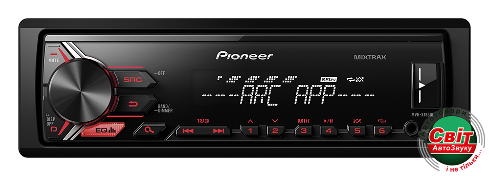 Pioneer MVH-X195UI - бездисковый медиа-ресивер (автомагнитола) 1DIN. Монохромный дисплей. Усилитель MOSFET 50Вт x 4, 5-полосный эквалайзер. Радиотюнер AM/FM (предустановка 24 станций). 1xRCA-выхода предусилителя, прямое подключение сабвуфера (управление уровнем), USB-порт 2.0 (1A) и AUX-вход на фронтальной панели. Функция MIXTRAX. Поддержка OC Android от v4.1 и выше, OC iOS (функция Pioneer ARC, iPhone 5 и выше). Поддержка аудиофайлов FLAC. Пульт ДУ в комплекте. Подсветка кнопок - красная.Характеристики: