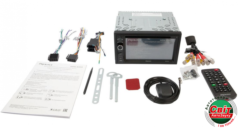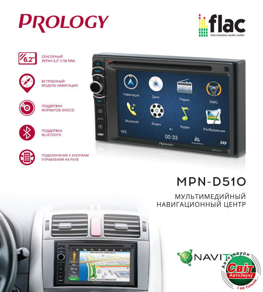 Автомагнітола Prology MPN-D510Мультимедийный навигационный центр PROLOGY MPN-D510 монтажного размера 2DIN обеспечивает прием радиостанций в диапазоне FM, воспроизведение DVD/CD-дисков, а также медиафайлов, записанных на карты памяти USB/SD и диски DVD/CD, работу с навигационным программным обеспечением Навител Навигатор, управление мобильным телефоном и воспроизведение звука через интерфейс Bluetooth, а также передачу звука и видеоизображения с внешних источников.