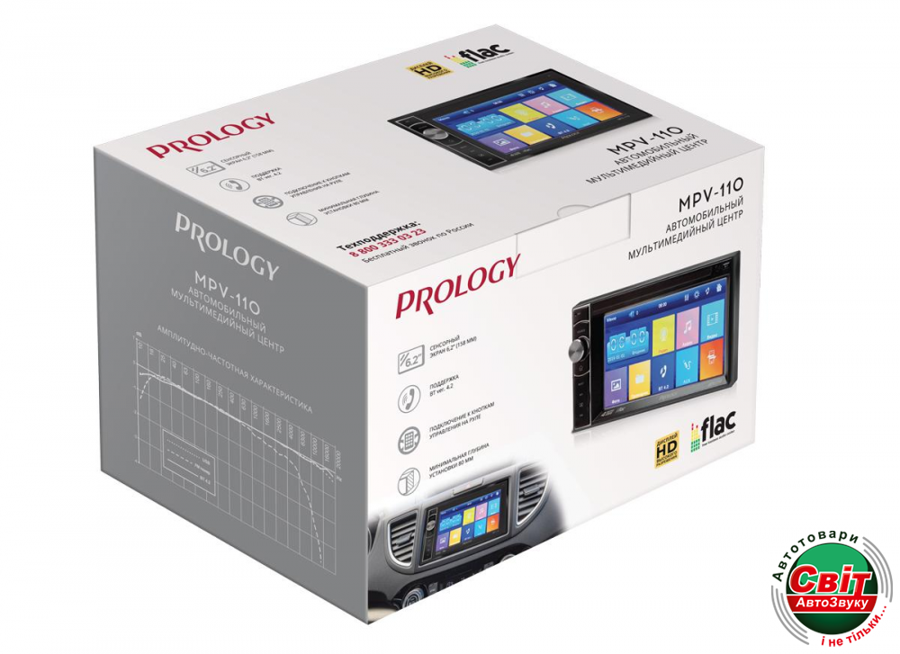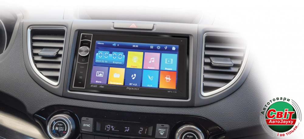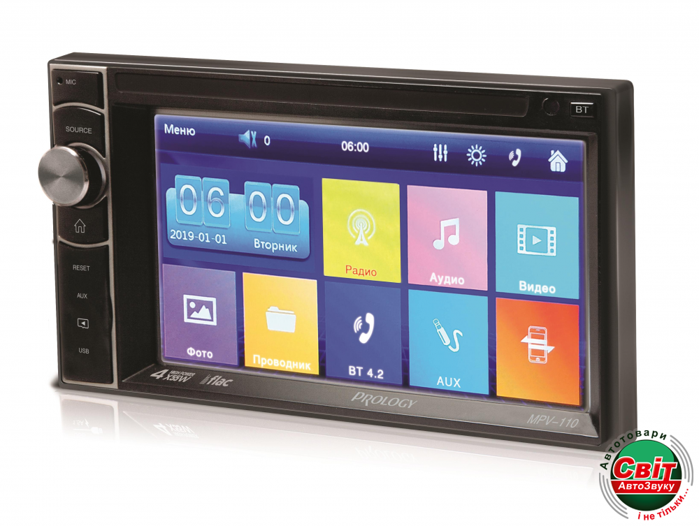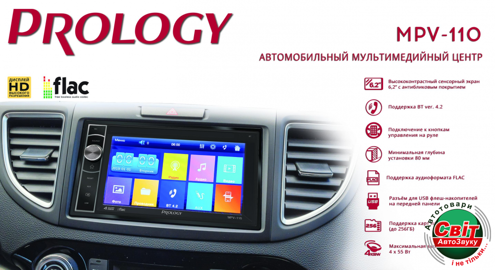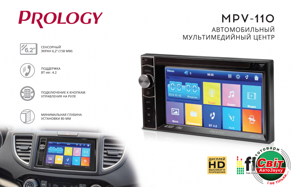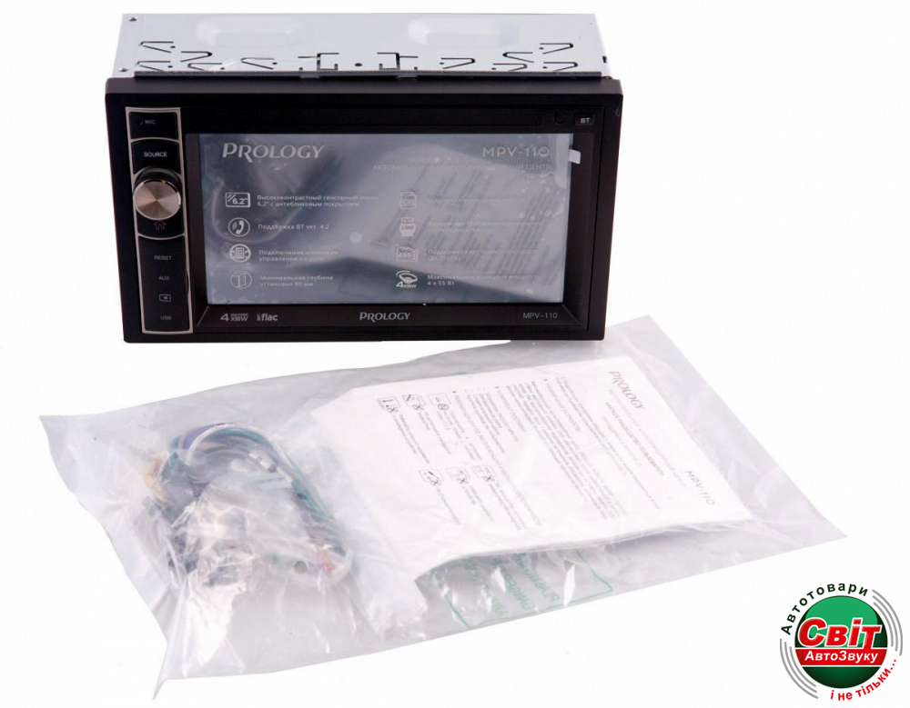 - Автомобильный мультимедийный центр PROLOGY MPV-110 монтажного размера 2DIN обеспечивает прием радиостанций в диапазоне FM, воспроизведение медиафайлов, записанных на карты памяти USB / microSD, передачу звука с внешних источников, а также управление мобильным телефоном через интерфейс Bluetooth (versia 4.2).