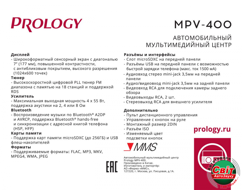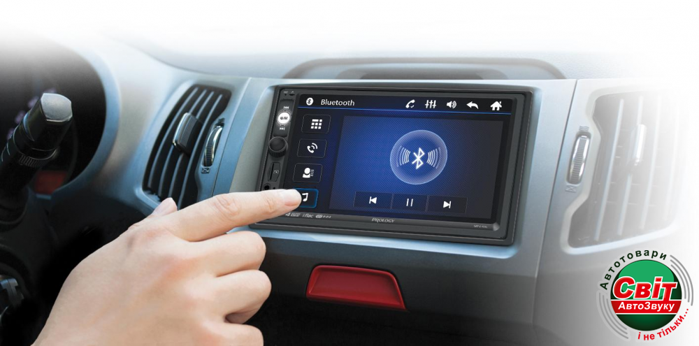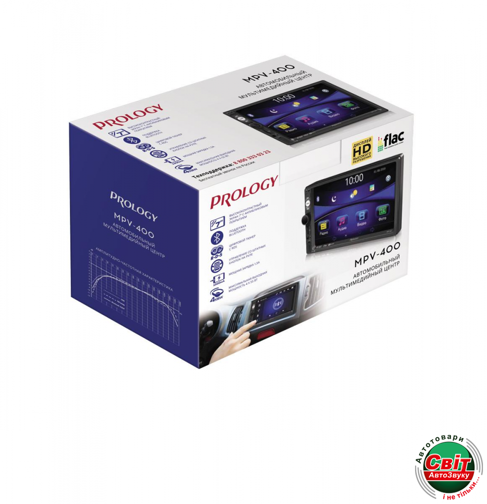Автомагнітола Prology MPV-400Автомобильный мультимедийный центр PROLOGY MPV-400 монтажного размера 2DIN обеспечивает прием радиостанций в диапазонах FM/УКВ, воспроизведение медиафайлов, записанных на карты памяти USB/microSD, управление мобильным телефоном через интерфейс Bluetooth®, а также передачу звука с внешних источников. Поддерживается подключение штатных кнопок управления аудиосистемой на руле (интерфейс SWC).