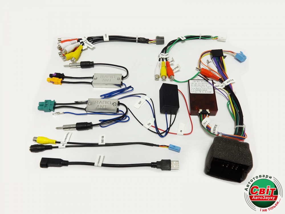 - Провода для подключения к штатной проводке автомобиля, камеры заднего вида, USB, 3G модема