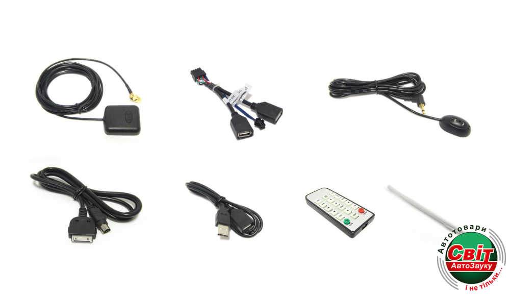 - Провода для подключения к штатной проводке автомобиля, камеры заднего вида, USB, 3G модема