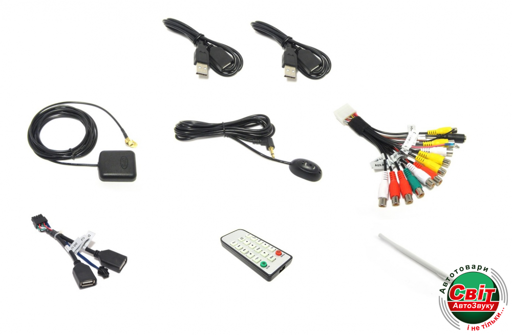 - Провода для подключения к штатной проводке автомобиля, камеры заднего вида, USB, 3G модема