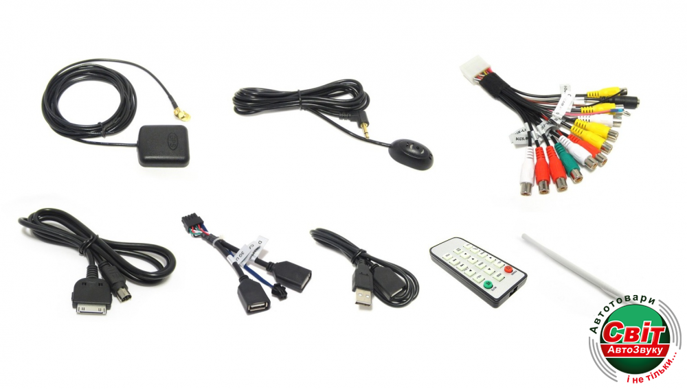 - Провода для подключения к штатной проводке автомобиля, камеры заднего вида, USB, 3G модема