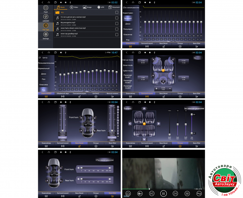 За качество звучания отвечает четырёхканальный усилитель звука TDA 7851, с мощностью 4х50 Вт / 4 Ом. Если хотите больше – всегда можно усилиться опционально, построив нужную аудиосцену. Для этого медиасистема оснащена необходимыми разъёмами: для акустики – ISO, доп.усилителю и subwoofer – AV-Out, для плеера и прочих коммуникационных девайсов подготовлен тыльный AUX. За звуковой тембр и баланс фронт / тыл / сабвуфер отвечает 32-х полосный эквалайзер, позволяющий провести отладку максимально точно. Вы можете выбрать воспроизведение аудио по папкам / трекам / исполнителям.