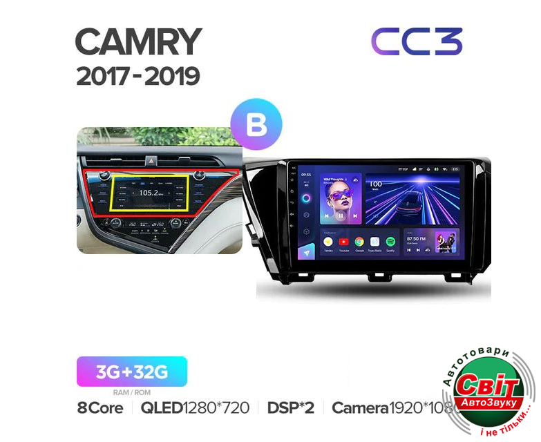 Автомагнітола штатна Teyes CC3 3+32 Gb Toyota Camry 8 XV 70 2017-2020 (B) 10Автомагнітола TeYes CC3 - це сучасний штатний головний пристрій побудований на якісних компонентах, з яким Ви отримаєте швидку швидкість роботи, багатофункціональність та універсальність засновану на новітній операційній системі Android 10, а повна інтеграція з оригінальними системами авто подарує приємні враження від кожної хвилини проведеної в автомобілі.