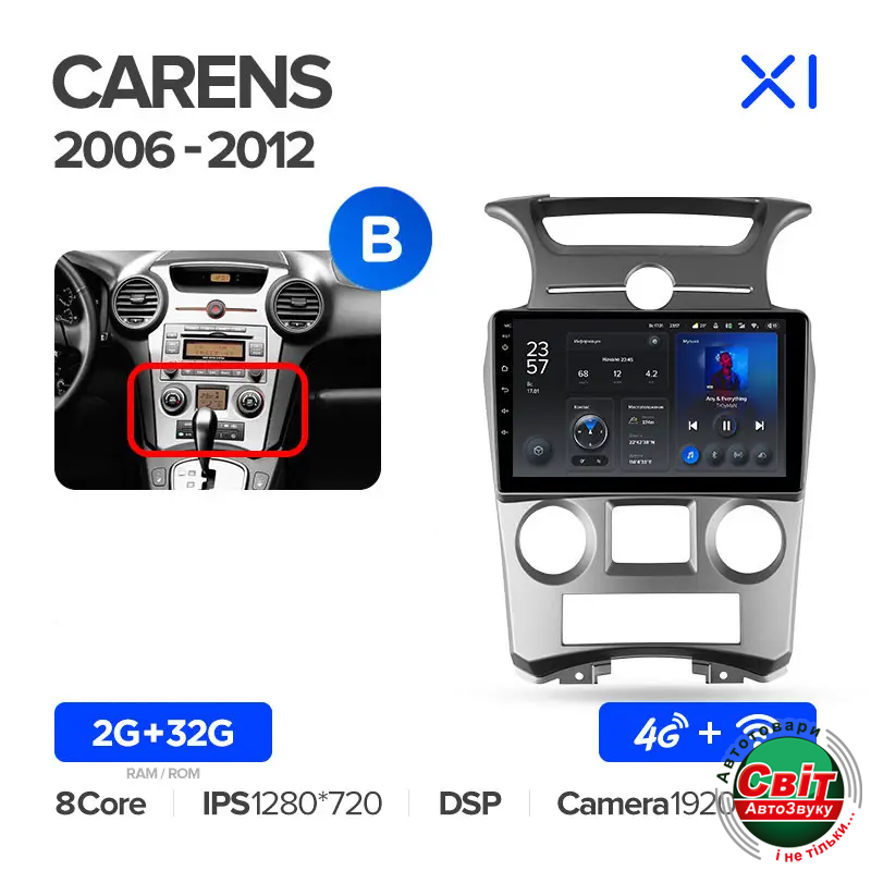 Автомагнітола штатна Teyes X1 2+32Gb Kia Carens UN 2006-2012-B 9Штатна автомагнітола TeYes X1 - яскравий приклад багатофункціонального навігаційно-мультимедійного пристрою, корпус якого максимально впишеться в інтер'єр салону. Висока якість складання та комплектуючих - запорука бездоганної роботи головного пристрою. Крім стандартних функцій, властивих і штатним моделям, автомагнітола Тіайс Х1 на ОС Андроїд 10 має масу додаткових можливостей.