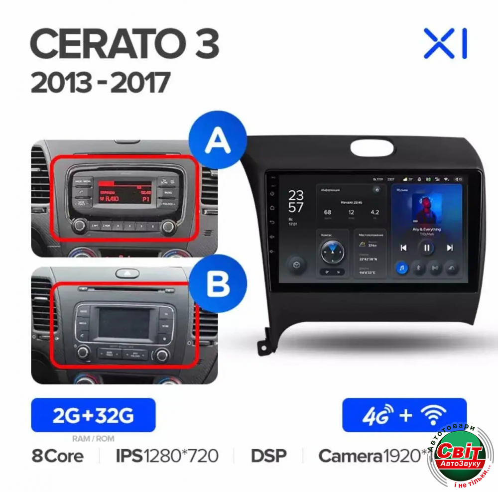 Автомагнітола штатна Teyes X1 2+32Gb Kia Cerato 3 YD 2013-2017 (K3 A) 9Штатна автомагнітола TeYes X1 - яскравий приклад багатофункціонального навігаційно-мультимедійного пристрою, корпус якого максимально впишеться в інтер'єр салону. Висока якість складання та комплектуючих - запорука бездоганної роботи головного пристрою. Крім стандартних функцій, властивих і штатним моделям, автомагнітола Тіайс Х1 на ОС Андроїд 10 має масу додаткових можливостей.