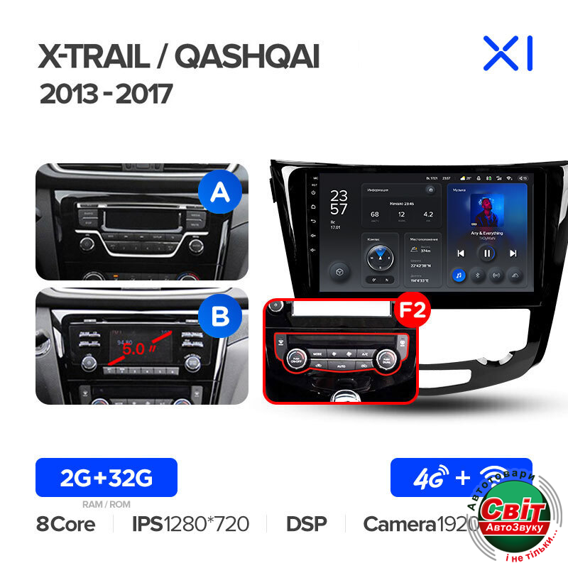Автомагнітола штатна Teyes X1 2+32Gb Nissan X-Trail X Trail 3 T32 2013-2017-Automatic air conditioning (B) 10Штатна автомагнітола TeYes X1 - яскравий приклад багатофункціонального навігаційно-мультимедійного пристрою, корпус якого максимально впишеться в інтер'єр салону. Висока якість складання та комплектуючих - запорука бездоганної роботи головного пристрою. Крім стандартних функцій, властивих і штатним моделям, автомагнітола Тіайс Х1 на ОС Андроїд 10 має масу додаткових можливостей.