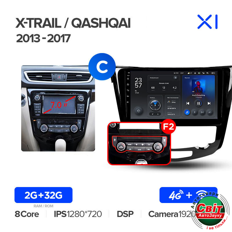 Автомагнітола штатна Teyes X1 2+32Gb Nissan X-Trail X Trail 3 T32 2013-2017-Automatic air conditioning (C) 10Штатна автомагнітола TeYes X1 - яскравий приклад багатофункціонального навігаційно-мультимедійного пристрою, корпус якого максимально впишеться в інтер'єр салону. Висока якість складання та комплектуючих - запорука бездоганної роботи головного пристрою. Крім стандартних функцій, властивих і штатним моделям, автомагнітола Тіайс Х1 на ОС Андроїд 10 має масу додаткових можливостей.