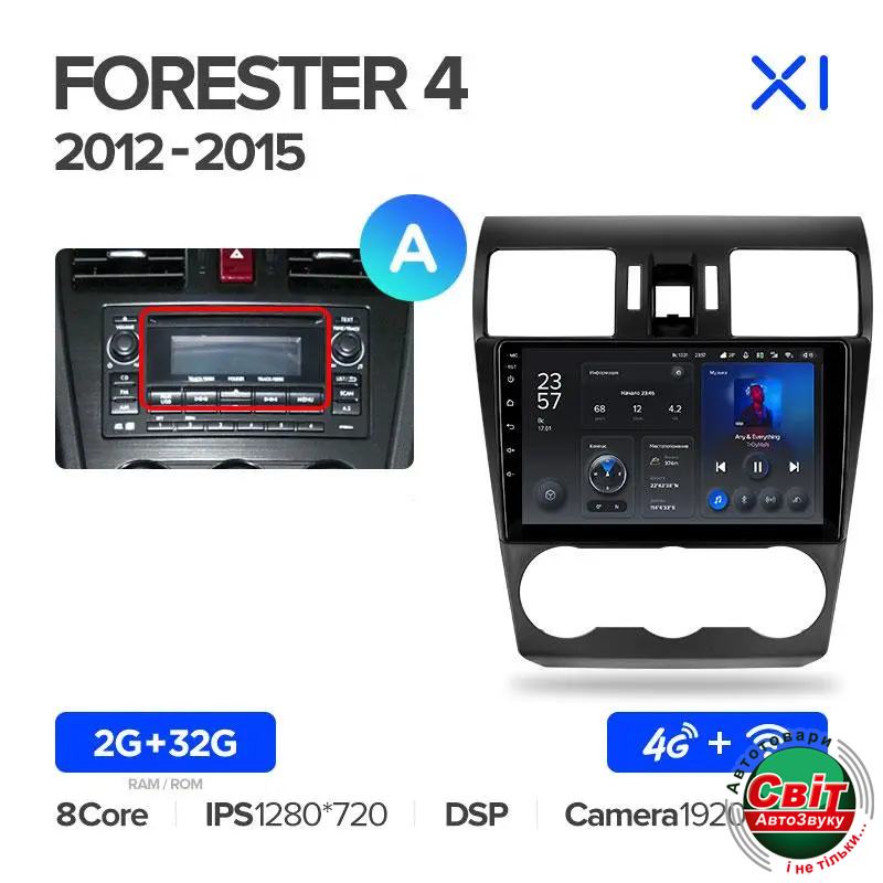 Автомагнітола штатна Teyes X1 2+32Gb Subaru Forester 4 SJ 2012-2015 (A) 9Штатна автомагнітола TeYes X1 - яскравий приклад багатофункціонального навігаційно-мультимедійного пристрою, корпус якого максимально впишеться в інтер'єр салону. Висока якість складання та комплектуючих - запорука бездоганної роботи головного пристрою. Крім стандартних функцій, властивих і штатним моделям, автомагнітола Тіайс Х1 на ОС Андроїд 10 має масу додаткових можливостей.