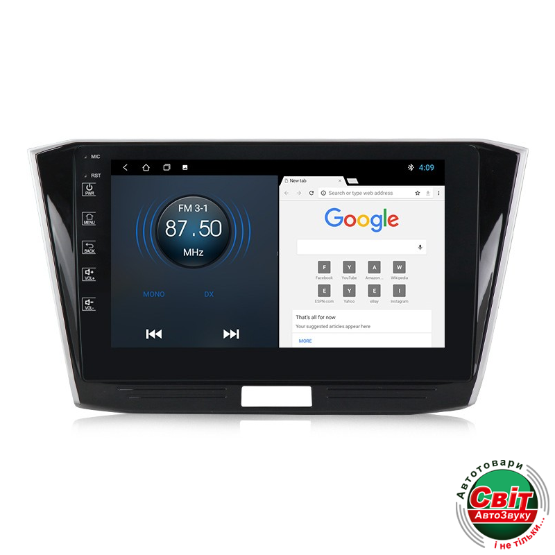 10" дюймів екран 2,5D IPS з HD роздільність 1280x7.Ємічний морозостійкий сенсор, мультитач до 5 дотиків (наприклад, масштабування і обертання карти навігації двома пальцями), сприйнятливий і легкий дотик - так само, як на сучасних смартфонах і планшетах. Екран дозволяє відтворювати відео в дуже хорошому вигляді, яскраві, соковиті кольори. Великі кути екрана дозволяють вам спостерігати за будь - яким сидінням вашої машини. Переобчислено поділ екрана на дві частини, що дає можливість одночасно використовувати дві програми, наприклад, навігацію і радіо.